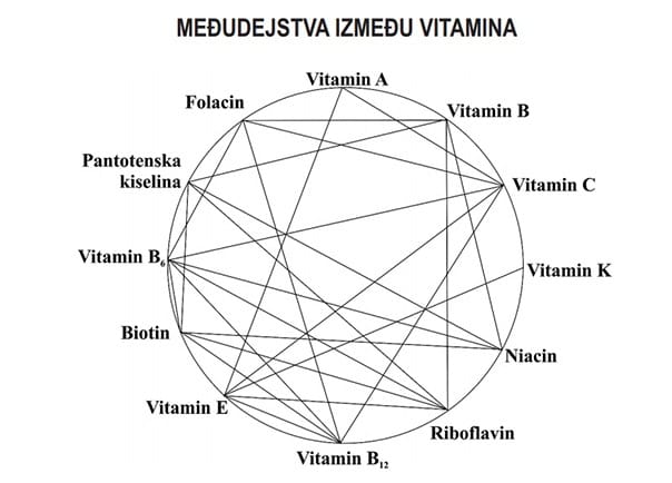 Na sličan način vitamini reaguju međusobno kao što je prikazano na dijagramu na sledećoj slici. Dijagram prikazuje 12 vitamina i 27 mogućih interakcija. Zapazimo da tri najviše korišćena vitamina u tabletama: A, C i E reaguju jedni sa drugima.