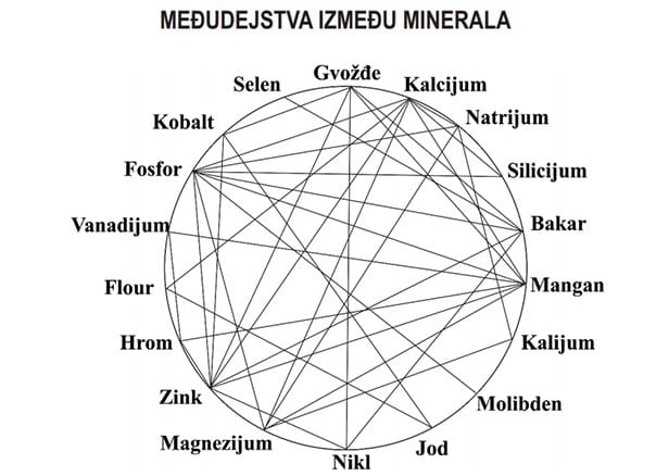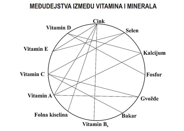 Takođe, uzimanje većih količina jednog vitamina ili minerala dovodi do poremećaja ravnoteže uzimanja i korišćenja drugih vitamina i minerala. Na primer, ako uzimamo velike količine vitamina C dan za danom, naše telo će povećati upijanje gvožđa, što bi moglo da prouzrokuje druge probleme. Međudejstva drugih minerala i vitamina mogu da izazovu smanjenje upijanja ovih supstanci. Na grafikonu na sledećoj strani može se pogledati 11 odvojenih međudejstava koje postoje između minerala i vitamina.